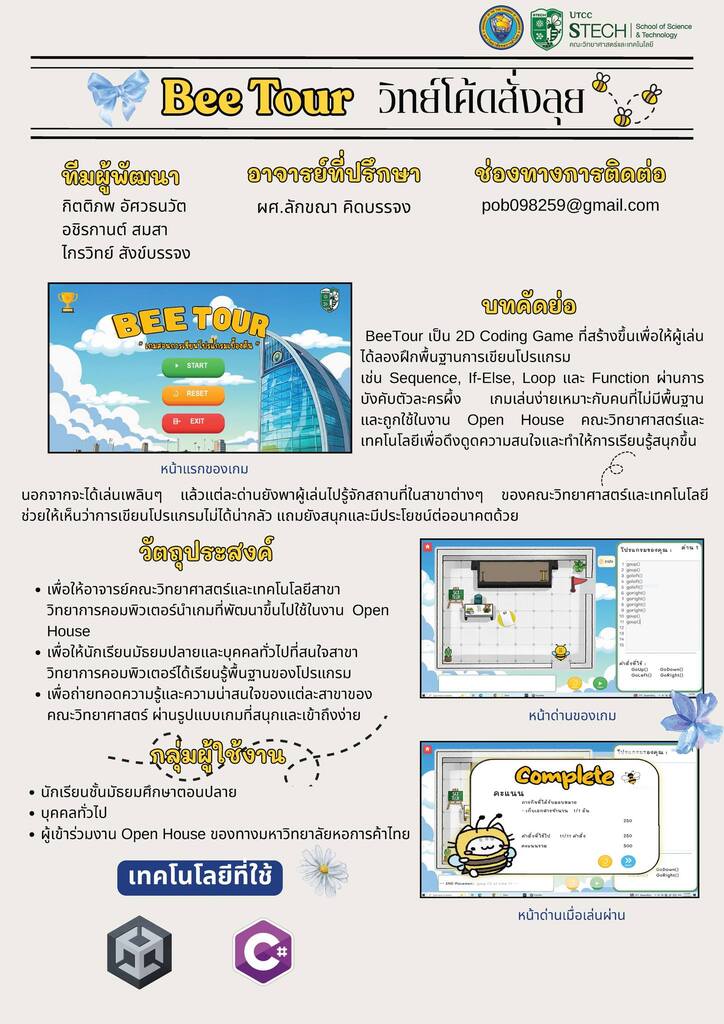 ในโอกาสที่ผลงาน “บีทัวร์: เกมบนพื้นฐานของการควบคุมด้วยคำสั่งสำหรับการเรียนรู้พื้นฐานการเขียนโปรแกรม” ผ่านเข้ารอบสุดท้ายในการประกวดผลงานนวัตกรรมสายอุดมศึกษา ประจําปี 2569 (Higher Education Innovation Awards 2026) (กลุ่มผลงานด้านวิศวกรรมศาสตร์ เทคโนโลยีปัญญาประดิษฐ์ และอุปกรณ์อัจฉริยะ)